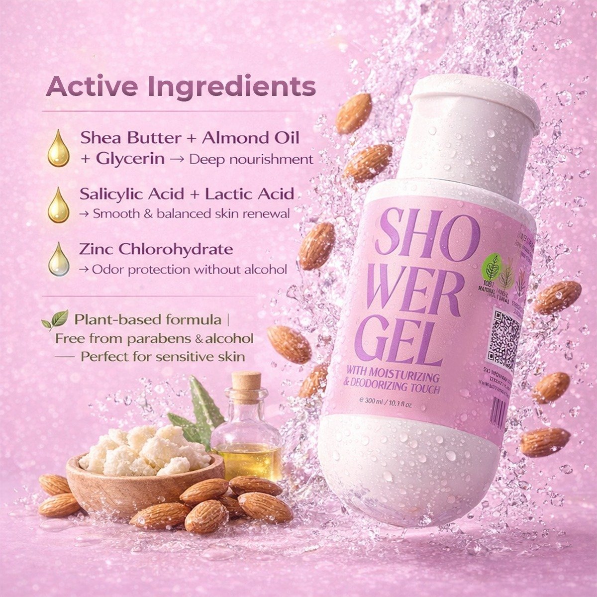Shea Butter, Almond Oil & Glycerin – Deeply nourish, moisturize, and help maintain skin hydration and softness.